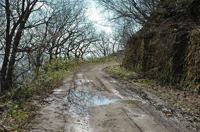 道道675号立待岬函館停車場線 一般車両進入禁止の砂利道編お知らせ函館山展望台からの景色を堪能した後は、道道675号立待岬函館停車場線の続きへ戻るため、つつじ山駐車場へ(22)。左側の山の向こう側は御殿山第二砲台がある。 駐車場の隅には一般車両が走れない砂利道区間の黄色いゲートがある(23)。ゲートの先を歩くことに関しては問題ない。道は函館山の西側を進む。 路面は、整備されていないので新しい砂利も敷いてないし、轍もくっきりで大きな石が出ている。また、元の道幅は広いようだが路傍は笹や木々が生えていて道幅が狭くも見える(24)。