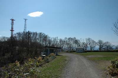 少し進むと、「月見台」と書かれた道しるべと右に分岐するがあり、右に別れる道(40)は、千畳敷砲台、そして(39)に見えるアンテナ施設につながっている。旧山道は右に行く道で、道道は直進。 ガードレールの道は(41)、やがてガーロドープに変わり、といっても、笹の下に隠れてしまっているが…(42)。 そして道は千畳敷見晴台に出る(43)。中央にあるコンクリの建物は休憩所になっており、そこから見る景色が(44)。