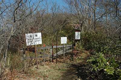 しばし歩くと左手に御殿山第二砲台に続く階段(25)、その先は右に90度曲り、(26)写真の先はUの字型でつつじ山の山頂をぐるっと回る。 写真中央の白い看板は、入江山高地観測所への入り口、また、穴澗へ続く廃道がある(27)。