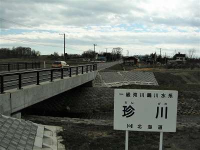 珍川を追え!お知らせ胆振地方の西端のむかわ町には、珍名の川が流れている。その名も珍川。調べ物をしていて、地形図を見ているときに発見。私の手元にある一般的に市販されている道路地図には、河川名は記載されていないので、他の出版社によるものにも記載されていないと思われる。 珍川という名前が気になっていたので、2005年のゴールデンウィークに訪問。また「え」氏の御厚意で2006年秋にも再訪となった。 今回はそのときに撮影した現状を紹介する。 今回は道路レポートではないです。川レポート。 国道235号を鵡川市街から鵡川の橋を渡り、セブンイレブンの交差点を右折。しばらく道なり行くと、立派な汐見1号橋があり、そこに 1級河川鵡川水系 珍 川 北 海 道 、 という河川標がある。
