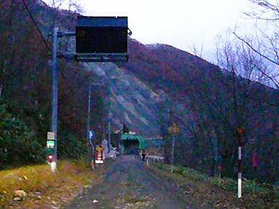 八幡覆道の手前に新しい電光掲示板が見える(27)。掲示板を過ぎると覆道の上で工事が行われていて作業車が何台か停まっていたが、暗くなってきたので作業は終えていた。 岩肌がむき出しの川縁は落石が常に起こってきそうで、覆道の存在無しでは、この道路は通行することは出来ない(28)。覆道は長いので、覆道内に待避所が設けられていたが、暗くて写真は撮れなかった。覆道を抜けると、工事基地に何台かダンプが停まっていた。こんな道で対向車がダンプだったら嫌だね〜。 覆道の先は(29)のように山側にネットがある。ここにレトロスペックな木製電柱?送電線の柱?が残っていた。 その先は右にカーブを振って左に大きく曲がると道路は川にへばりつくように500mほど走り、やや開けた場所が現れる(30)。写真内に案内板が反対向きにあるけど何だったのだろう?