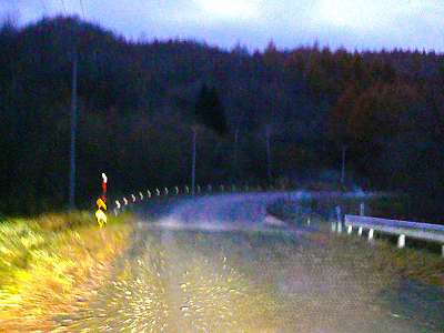日が陰ると、11月は暗くなるのが早い。薄暗くなった道を走る。 地形は先ほどのような険しい道ではないが、架け替えられた橋を渡ったり右左にカーブをしながら進む(35,36,37)。 (37)付近では国道274号の街路灯がちらちら見えてくる。 やがて舗装区間になって(38)やれやれといったところだが、この先また砂利道区間となる。この付近にも廃屋があったと思う。