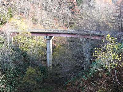 残念ながら手前の木々が邪魔して写真では分かりにくいが、橋の上のには板が載っているが、腐ったり、緑の苔?が生えているような状態。その板すら崩落している部分も。 夏場は緑に埋もれて解らないでしょう。 この周囲は森林しかなく、橋脚のコンクリートもボロいし、この橋って…なんでここに存在しているの??、森林鉄道なんてあった訳ないしなあ〜と、訪問時は何の予備知識もなく眺めたのだった。 現在は無人地帯のだけど、このページを作るにあたって、航空写真や地図をネットで探したら炭鉱が繁栄していた頃の昭和38年の写真が見ることが出来、この辺りにも集落があったことがわかった。 集落が消滅して、後植林時の林道として使われ役目を果たしたのかな? 今は欄干みあたらないけど、当時はまさかあったのでしょうね。欄干ないと危なくて怖いよなあ〜。川面まで30mはあるかな? その先には美唄ダム(11、12)がある。 このダム湖の下にもかつては生活の場であったことは、「地図・空中写真閲覧サービス」(旧国土変遷アーカイブ)の空中写真で知った。 美唄ダム工事は1969年から開始され、1982年に竣工された。