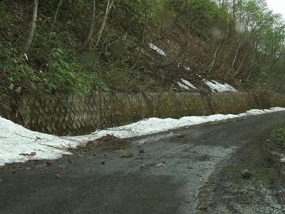 函岳への道だけじゃなく、スーパー林道も通行出来ない常態。(15)の轍を見ると何台か車通った感じでまだまだ進めそうな感じだったのですがね。先ほど(5)地点付近ですれ違った商業車は何だったんだろう…、まさかここまで来て引き返したのか???。 当然ここで断念。Uターンしてすぐ引き返したいが、雪面で切り替えしてスタックしたら一大事(4WDを過信して夏タイヤを甘く見ると本当に嵌る)。ってことで、切り替えし出来る雪の無い地点(14)まで400mちょっと、乗り慣れていない車で本当にヒヤヒヤしながらバックしてUターン。だって路肩から脱輪も一大事でしょ? 完走出来なかったけど、国道の通行止め見ていたから気持的にもダメもとと割切れたし、逆にいい経験できて良かったよ〜。 路面★★★☆☆ 景色★★☆☆☆天気のせい 2005年6月3日訪問 |