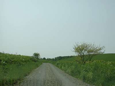 美瑛市街からマイルドセブンの丘への道を進み、美田地区で国道452号とぶつかる所が出発点である(1)。道は整備されており、快走路が2キロ半続く。この区間にだけ道道番号つきのヘキサ標識があった。道2本(旧道?)が合流してくると、砂利道となり狭くなる(2)。 砂利道に入りすぐ分岐があるが、道の悪いほう(直進)が道道である(3)。ちなみに分岐する舗装路は今年から舗装されたみたい(何故この道を舗装なのか…)。