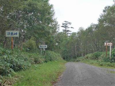 「熊注意!!山菜とるか命をとるか」みたいなことを書かれた熊出没の注意書きが道路上に何個かあり、約2キロ走ると「楽園への入口」浮島湿原の案内板がある(4)。 案内板は風雪に耐えられないためか、浮島湿原と書かれた板は下に落ちていた。ここには水洗トイレと整備された駐車場がある。