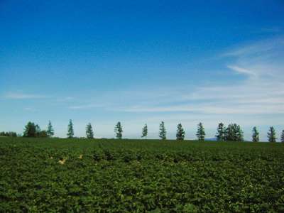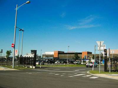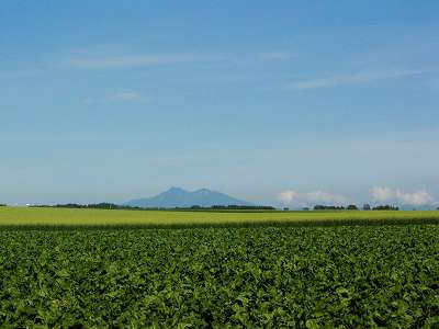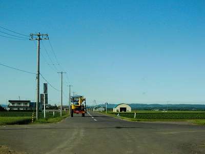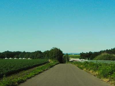 その谷底からまた樹林を抜けると、一面の畑の遠くに、斜里岳が見える(11)。 台地に上がった最初の交差点で道路が2車線道路となり(12)、そのまま進むと女満別空港が現れる(13)。