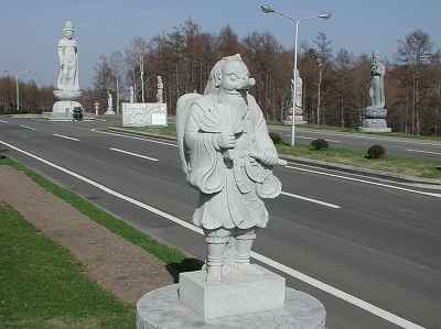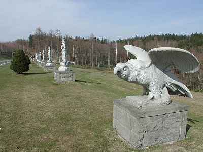 真駒内滝野霊園 2002年訪問時お知らせ札幌南部には、緑に囲まれた広大な丘陵公園霊園が存在している。 最初の訪問は2002年4月のものである。開園20周年が過ぎた頃のもので、2020年現在と比較すると、大分異なる点が生じている。 ![]() 入口では四天王のブロンズ像が出迎え、人頭有翼の獅子像の向こうに、巨大なイースター島のモアイ像が並んでいる。北の大地に巨大モアイ!シュールだねえ。 そしてその向かいには、これまたモアイとはかけ離れているストーンヘンジが原寸大で再現されている。 ![]() 札幌市中心部より車で40分で、世界の不思議旅が2つも味わえるのである。 ![]() ストーンヘンジは中国のテン・タンイさんが2,300トンの 石を提供して出来た。これまたモアイのそばにあるわけだから世中とは別世界感が強いのだ。 ただ、デートしているカップルやストーンヘンジ内でくつろぐ親子を見ると別世界から日常に戻った気になる、 ![]() ここから車で墓地までの道のりは約1キロあり、沢山のお地蔵様、仏像、観音様、その他私にも天狗と鷲?など法則性が理解できない石像が並んでいるのである。 2020年現在、このエリアの石仏は撤去されてどこかにあると思われる、 ![]() 参考にした作品はわからない結構大きな石像もあったが、2020年現在、造成され墓地になって存在していない。 モアイ、ストーンヘンジ、東洋的、欧州的石像などのカオス。和洋折衷っていうのはこういうことをいうのだろう。 御霊が眠る墓地は、デザインの統一された墓石がズラリと並ぶ姿は圧巻であった。。 その後2011年6月に訪問したものはこちら。 現在は、大仏は開園30周年事業として、安藤忠雄による設計で頭大仏として2011年の姿とは異なる形で存在している。また2020年現在、そばにあったストーンサークルが移転、園内の道路が大規模に付け替えられ、墓地も大規模に拡大、2002年訪問時の面影とは大分異なっている。 |