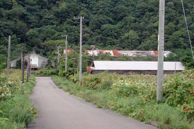 舗装が切れるとその先の道は廃道になっている。2002年時訪問時は草が生い茂っていた状態だった。2006年雪解け間もない頃訪問時は、轍が確認できたが車は入ることは困難に見えた。 この先には、小規模のマンガン鉱山の今井鉱山があったが、中外鉱山よりかなり時期に廃鉱となっており、人の往来も少ないため、訪問は困難を極めるであろう。 ここまでは、鉱山の施設を紹介したが、鉱山によって栄えた町の遺構も残っていた。