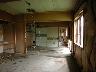 道道北側(2001年撮影)草木にそれほど被われていない住宅跡もあった。 それらの中には、道路工事や公共事業の工事事務所として使われたような形跡もあった。