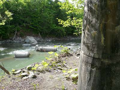 道道はやがて曙橋で十勝川の支流、トムラウシ川を渡るが、その橋の約800m手前のカーブ付近が、十勝川とトムラウシ川の分岐である。 そこには、倒れた橋脚群が印象的な遺構があり、ここは比較的簡単に近くまで行くことができる(28〜31)。