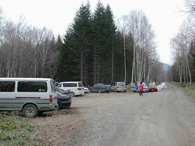 続続 幻の橋を見に行こう!!(東大雪アーチ橋群) 地震によって崩落した後の様子お知らせ2003年9月26日4時50分頃に十勝沖の深さ約40kmでマグニチュード8.0の地震が発生し、十勝支庁管内では、震度6弱、鹿追町、幕別町、豊頃町、虫類町、震度5強、足寄町、帯広市、本別町、更別町、広尾町、震度5弱、音更町、上士幌町、清水町、芽室町を観測。この十勝沖地震の影響でか、タウシュベツ川橋梁が一部壊れてしまった。2004年5月2日午後、崩壊後の橋ならびに士幌線跡のアーチ橋群を、見に行ってきた。 2004年5月の連休、えさんの御厚意により地震崩壊後の橋を見ることが出来た。いつの間にかこんなに有名になってしまったのか?(注1)と思うほど林道内は対向車とすれ違った。しかも、林道は除雪が完全に行われていないため、離合箇所もかなり限定されてしまっていた。駐車スペースは、ファミリーワンボックスカーも多く林道内の駐車場としては変な感じでしたね。 (注1):タウシュベツ川橋梁、この「幻の橋を見に行こう」のページを作った2001年頃は、この橋自体を取り上げたサイトは非常に少なかったけど、2005年、今回久しぶりにこの続編を作るにあたってワード検索してみるとたくさんのサイトでも紹介されるようになっていた。北海道遺産としてPRされたことも大きいのでしょう。