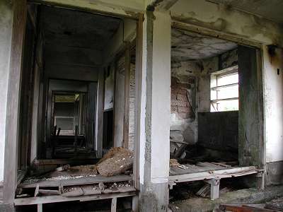 丘の上の牧草地の中に2棟佇んでいる廃アパート。 1つは白く、もう1つはコンクリートを一層塗った壁が剥がれて中のブロックが剥き出しもので、何故この建物だけ残っているのかが不思議である。というのも現在の牧草地からではその痕跡が全く判らないが、本で古い地図を見ると他にも何軒も炭鉱住宅が並んでいたからである。